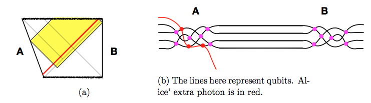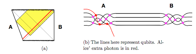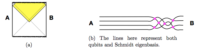 By now, we can see that computations changing Bob's density matrix are connected to the growth of his "one-sided black hole", that is, the interior spacetime in his entanglement wedge. So we would expect the computations which don't change his density matrix, i.e. the Schmidt rotations, fuel the growth of the entanglement region between Alice and Bob. Thus, there is a subregion duality connecting types of operations to regions of space. To check this, it's possible to do a more precise matching between the volume growth of different regions as the photon gets scrambled, creating an "epidemic" of "sick" gates in the quantum circuit.![]() |
